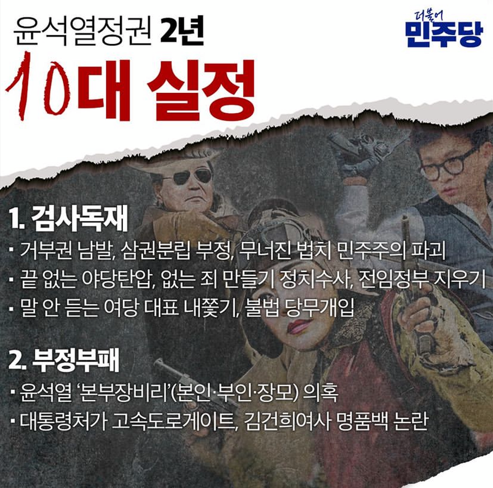 윤석열 정권의 기괴하고 엽기적인 행태가 지속되고 있는 가운데, 최근 더불어민주당은 인스타그램 공식 계정을 통해 윤석열 정권 2년간의 실정을 10가지로 요약하여 게시하였습니다. 윤석열 정권 2년 10대 실정 이라는 제목의 글에는 아래의 항목들이 10가지 실정으로 기재되어 있습니다.