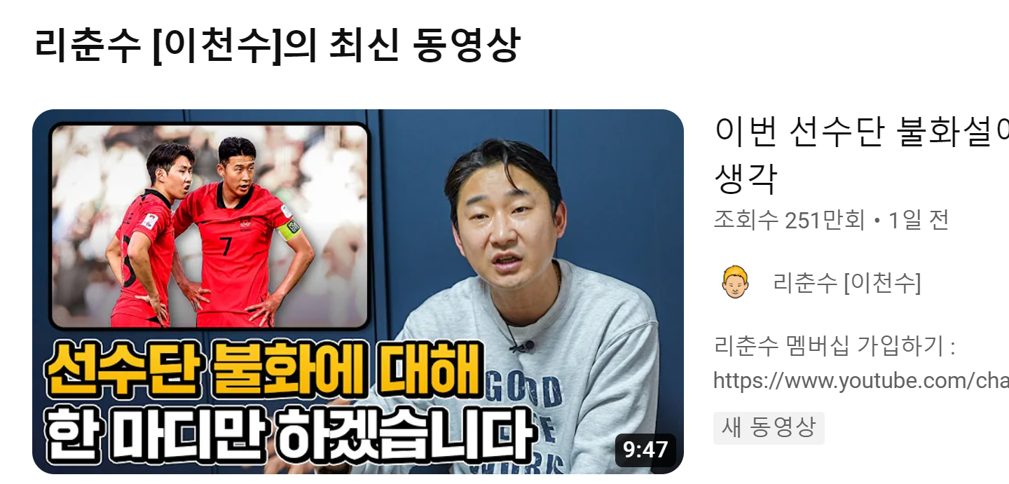 국가대표 출신 축구인 이천수씨가 최근 불거진 아시안컵 축구 국가대표팀 불화설에 대해 본인의 유튜브 계정을 통해 소신발언을 해 화제가 되고 있습니다.