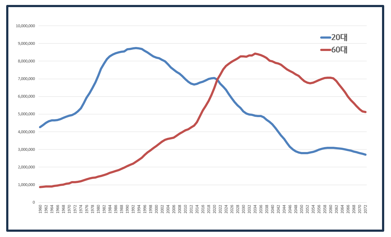 20대 vs 60대 인구 추계 (1960년~2072년)