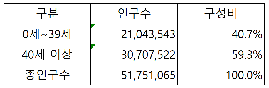 구체적으로 0세~39세의 인구와 40세 이상의 인구 구성비를 비교해 보면 아래와 같습니다. 즉, 우리나라 40세 이상 인구 비중은 59.3% 이며, 40세 이상 인구는 40세 미만 인구보다 약 966만명 더 많습니다.