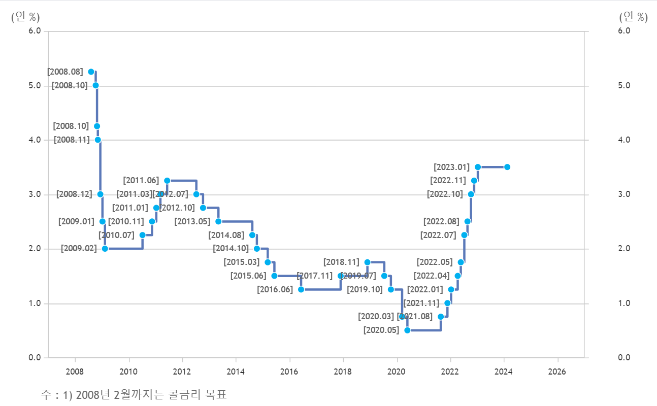 아래는 2008년 부터 2024년 2월 최근까지의 금리변동 추이 입니다. 24년 2월 현재 한국은행 기준금리는 3.5% 입니다.