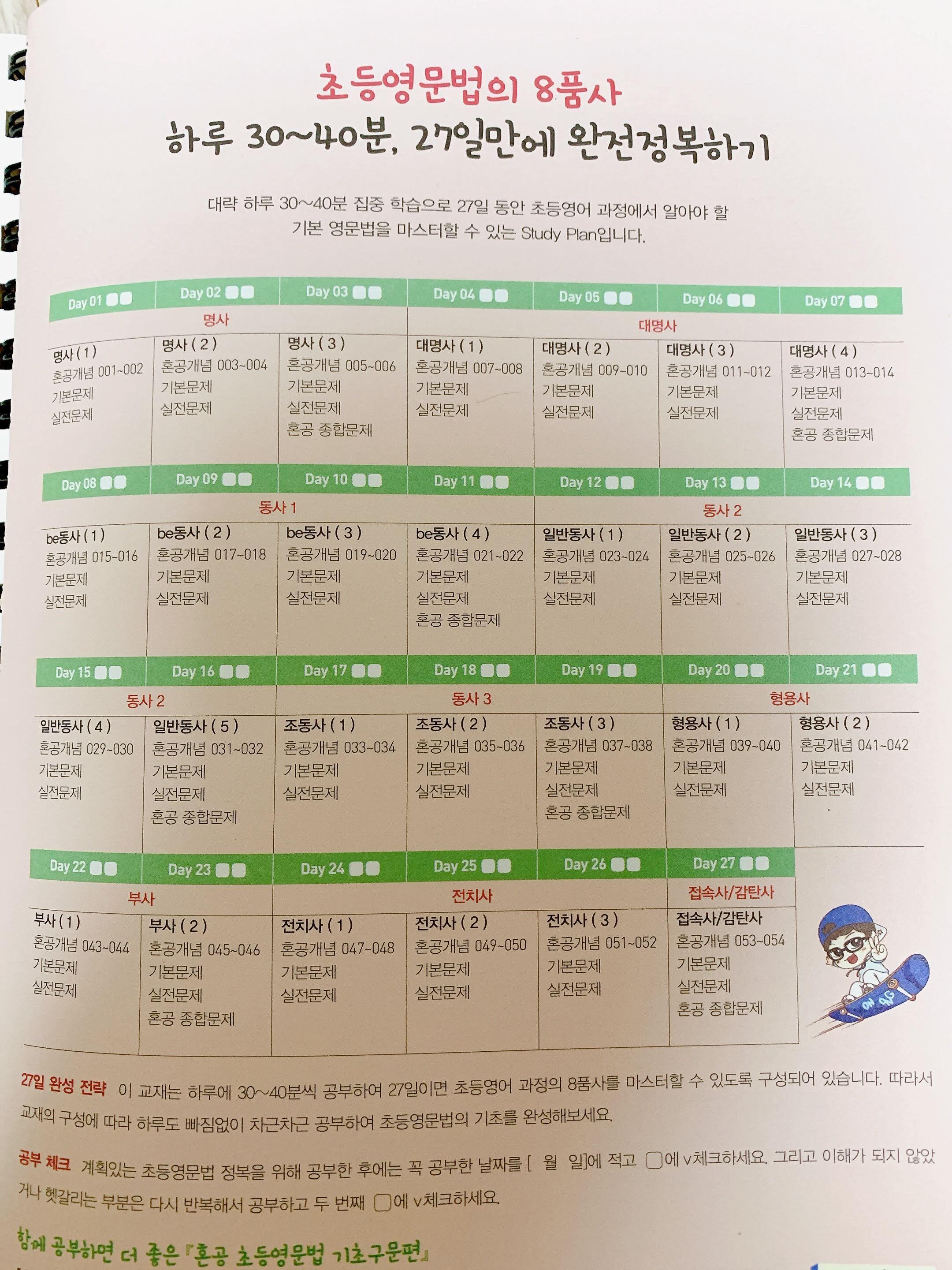 총 27일 과정 중 명사, 대명사, 동사 이렇게 3가지 품사에만 19일 분량의 내용이 구성되어 있습니다. 즉, 실제로 많은 문법개념 설명이 명사, 대명사, 동사에 집중되어 있습니다. 이 세가지 품사가 문장의 기본 뼈대를 이루고 있기 때문에, 중요 품사에 적당한 설명이 배분되어 있는 것 같습니다.