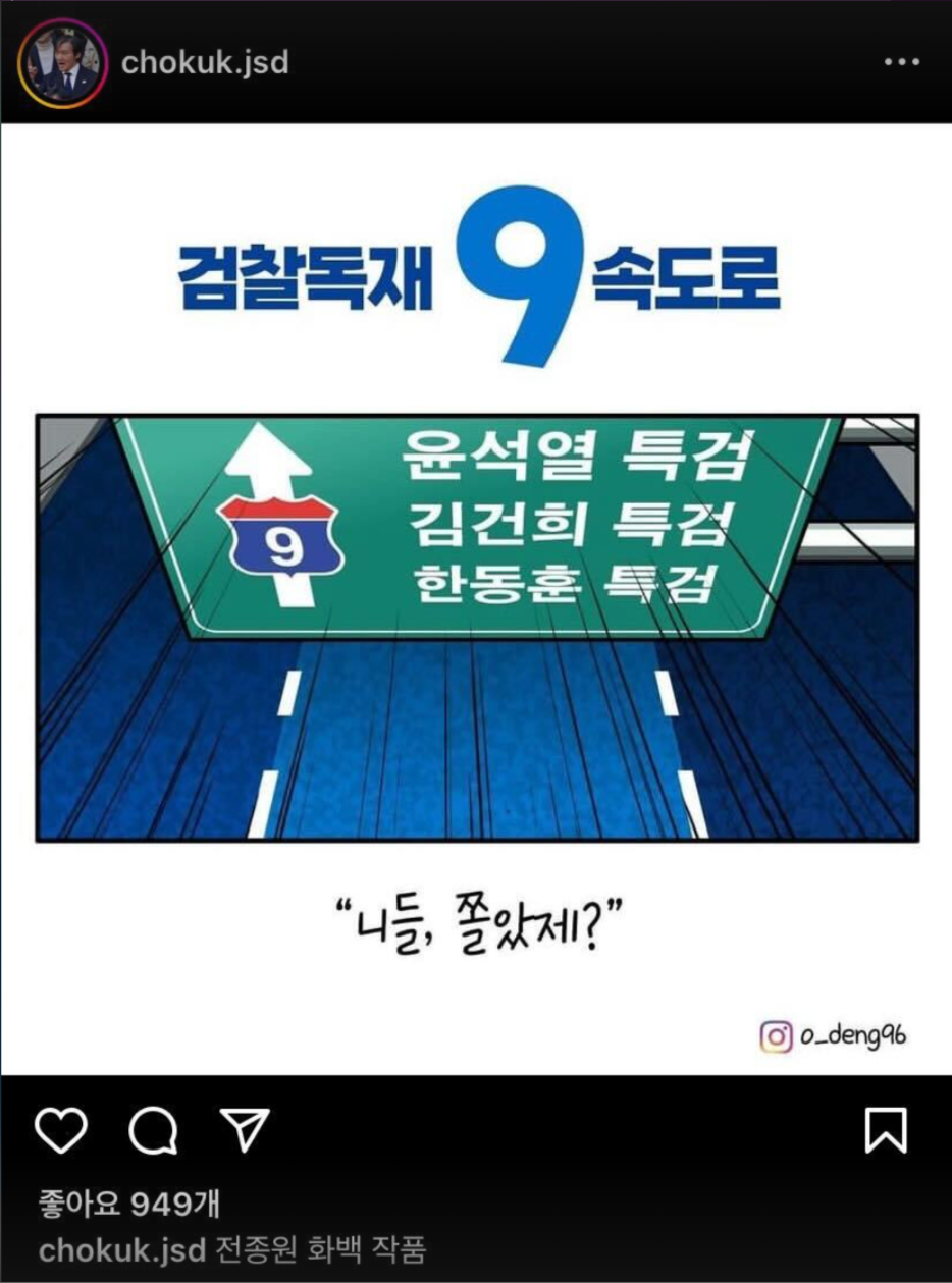 현재 조국혁신당 대표인 조국 전 장관은 SNS계정을 통해, 검찰독재를 비판하는 게시글을 올렸습니다. 해당 글에는 '검찰독재 9속도로' 라는 문구와 함께 이정표에 '윤석열 특검', '김건희 특검', '한동훈 특검' 이 나란히 적혀있습니다. 이는 명백하게 윤석열 정권에 대한 강한 비판입니다. 동시에 윤석열 정권의 범죄의혹을 수사할 수 있는 특검법 발의에 대한 강한 의지를 표명한 것으로 풀이됩니다.