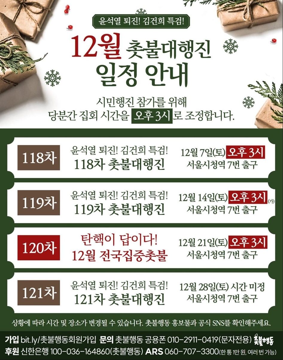 이에 12월에도 매주 윤석열 탄핵을 요구하는 집회가 열릴 예정입니다. 아래는 시민단체 '촛불행동' 페이스북 페이지에 게시된 12월 윤석열 퇴진 집회 일정 안내 이미지 입니다.(상세한 집회 일시와 장소는 추후 변경될 수 있습니다.)