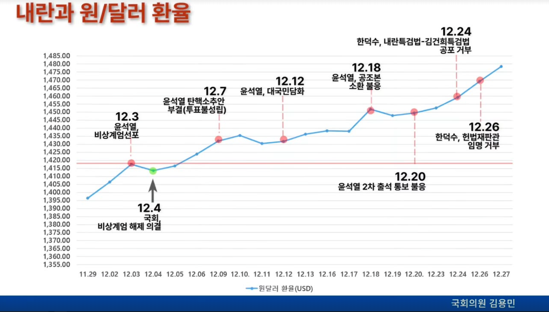 12월3일 윤석열 내란사태 이후 원달라 환율은 어떤 흐름을 보였을까요? 최근 민주당 김용민 의원은 '내란과 원/달러 환율' 이라는 게시물을 통해, 12.3 내란사태 이후 일자별 주요 사건과 환율의 움직임을 정리하여 공유하였습니다.