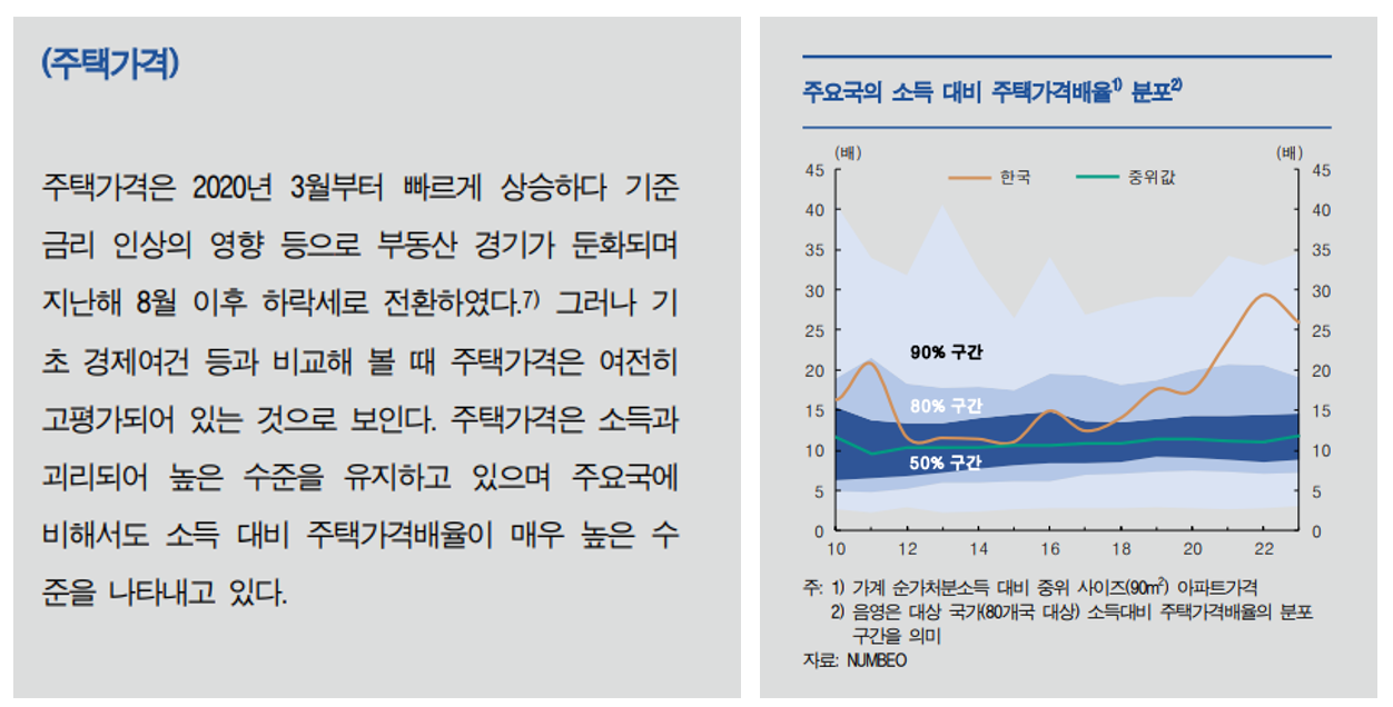 한국의 주택가격은 최근 몇년간 급격하게 상승한 탓에, 최근에는 가격 하락세가 두드러지고 있습니다. 더이상 이렇게 높은 가격에 주택을 구매할 수 있는 유효수요가 없습니다. 한국은행 역시 한국의 주택가격이 해외 주요국에 비해 매우 높다고 인정했습니다. 한국은행은 23년9월에 발간한 통화신용정책보고서를 통해 아래와 같은 의견을 제시하였습니다.