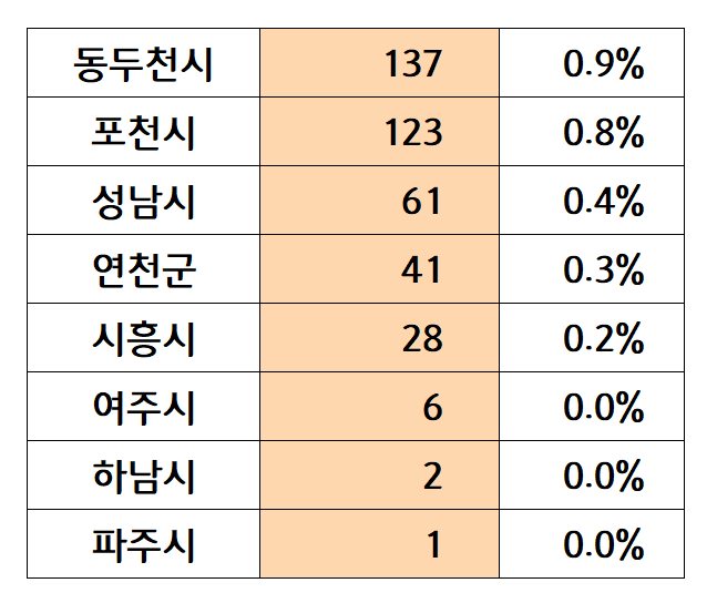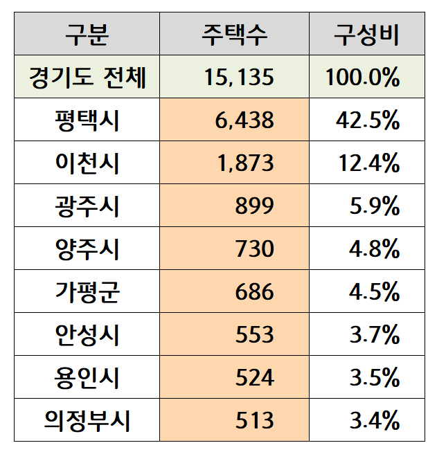구체적으로 경기도 내 도시별 미분양 아파트 건수 현황은 아래와 같습니다. 특히, 미분양이 가장 심각한 도시는 평택으로 경기내 전체 미분양 아파트의 42.5%를 보유하고 있습니다. 또한, 그 뒤를 이어 이천, 광주, 양주의 미분양도 심각한 상황입니다.