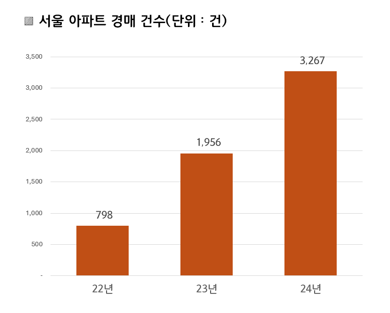 2024년의 서울 아파트 경매건수는 3,267건으로 2022년 대비 4배가 되었습니다. 증가율로 보면 무려 309.4% 증가한 것입니다. 그야말로 아파트 경매건수의 폭증 상황이 벌어진 것 입니다.