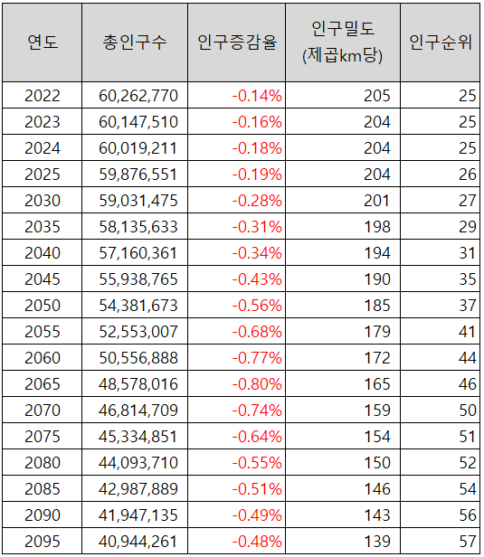 인구 하락세는 이번세기가 끝날때까지 지속되어 2095년에는 4천명대 초반인 40,944,261 명까지 감소할 것으로 예측됩니다.