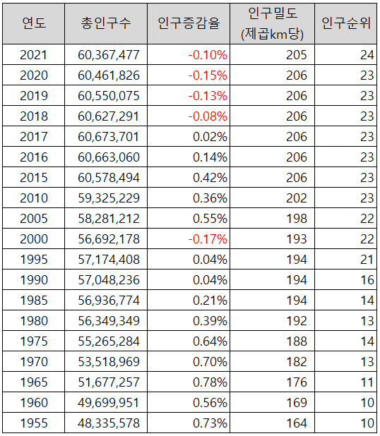 3. 과거(1955년~2021년) 연도별 이탈리아 인구 현황