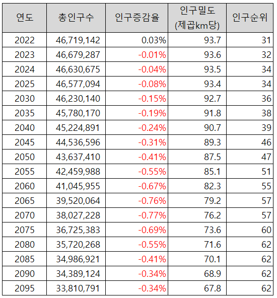인구 하락세는 이번세기가 끝날때까지 지속되어 2095년에는 3천380만명 수준까지 감소할 것으로 예측됩니다.