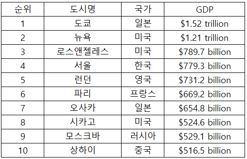 한국의 서울은 4위에 있습니다. 우리나라의 인구와 경제활동 대부분이 서울에 집중되어 있어, 도시별 GDP 순위에서도 서울의 순위가 높게 나타나는 것 같습니다.