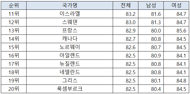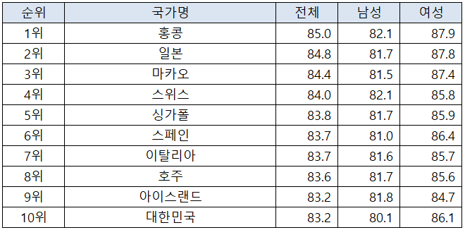 한국은 83.2세(남성 80.1세, 여성 86.1세) 로 기대수명 세계 10위 입니다.