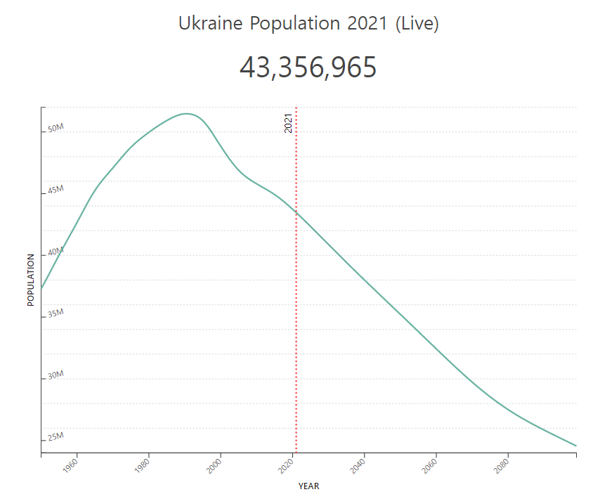 우크라이나의 인구는 1991년 5천146만명 수준이었으나, 2021년 현재는 약 8천만명이 줄어든 4천3백만명 수준입니다.