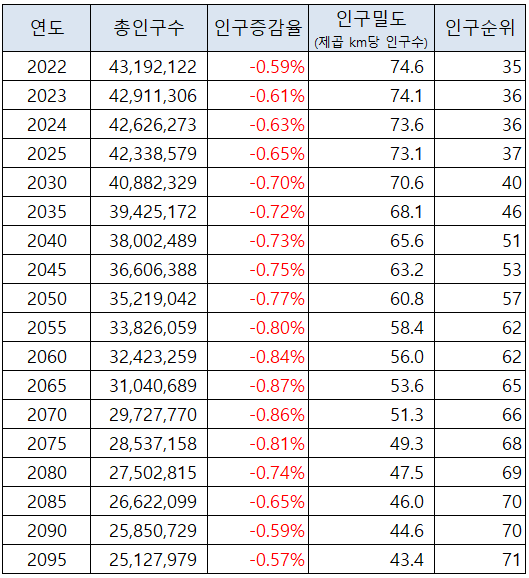 2095년에는 현재보다 약 1천8백만명 감소한 2천5백만명 수준의 인구수를 기록할 것으로 보입니다.
